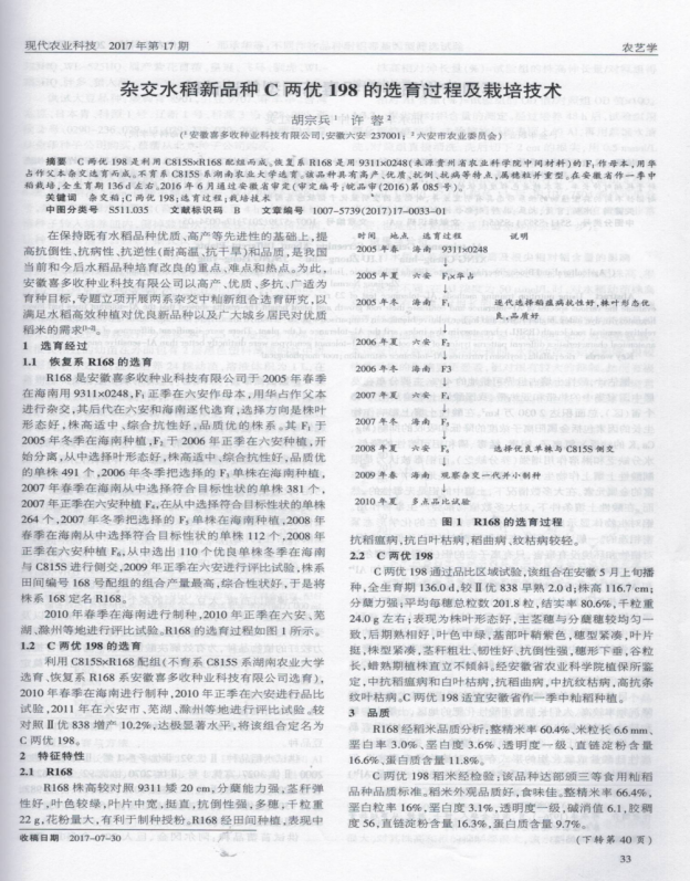 “雜交水稻新品種C兩優(yōu)198的選育及栽培技術(shù)”在《現(xiàn)代農(nóng)業(yè)科技》2017年第17期公開(kāi)發(fā)表