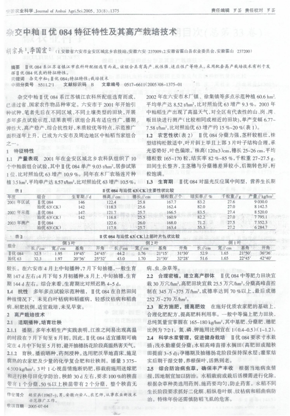 “雜交中秈II優(yōu)084特征特性及其高產(chǎn)栽培技術(shù)”在《安徽農(nóng)業(yè)科學(xué)》2005年第8期公開發(fā)表