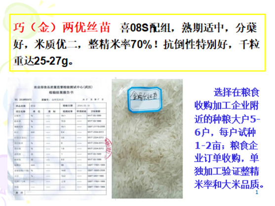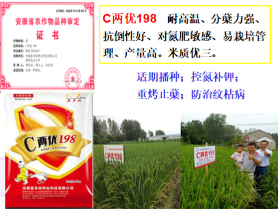 會上,六安市綠色發(fā)展研究會研究員王林,著重介紹了安徽喜多收公司為配合裕安區(qū)專用品牌糧食生產(chǎn)而精心挑選的、由公司自主培育的“C兩優(yōu)198”、“深兩優(yōu)571”、“喜兩優(yōu)絲苗”、“巧兩優(yōu)絲苗”四個雜交水稻新品種。針對這四個品種所具有的抗倒伏、耐高溫、抗病蟲、高產(chǎn)量、米質(zhì)優(yōu)、整精米率等特征特性,配套的栽培管理技術(shù)要點,與專用品牌糧食生產(chǎn)示范項目配合計劃安排等問題作出簡明扼要的闡述。得到了與會各方的認(rèn)知認(rèn)同。