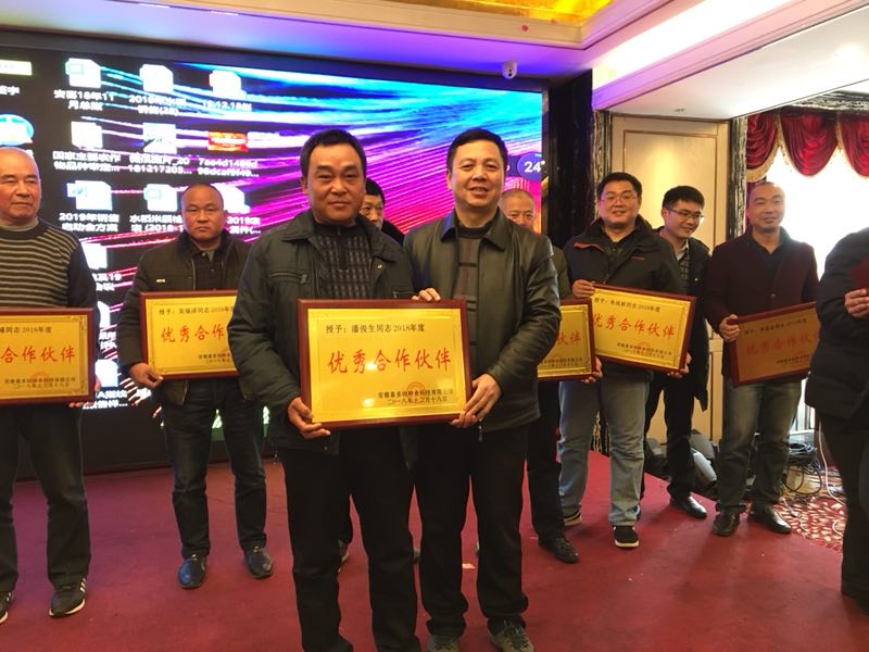 2018年12月17--18日在六安市永泰大酒店,來自金安區(qū)、裕安區(qū)、霍邱、壽縣等地的鄉(xiāng)鎮(zhèn)經(jīng)銷商和種植大戶等200余人歡聚一堂,共享2018年合作營銷成功的喜悅、共商2019年合作經(jīng)銷共贏的計策。