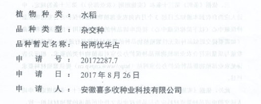 裕兩優(yōu)華占品種權(quán)申請(qǐng)受理通知書(shū)