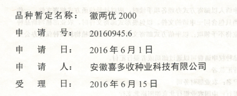 徽兩優(yōu)2000品種權(quán)申請受理通知書