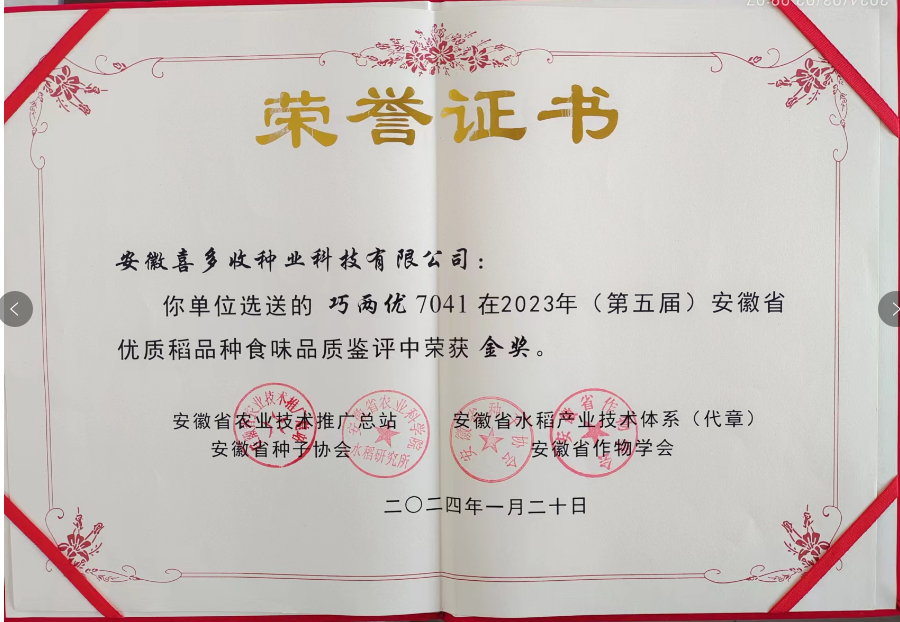 2021年通過(guò)安徽省審定品種,鄂、豫贛、 閩引種,2023年(第五屆)安徽省優(yōu)質(zhì)稻品種食味品質(zhì)鑒評(píng)中榮獲金獎(jiǎng),巧兩優(yōu)7041米質(zhì)優(yōu)二、香型、長(zhǎng)寬比3.8、整精米率高、株型適中、抗倒伏.