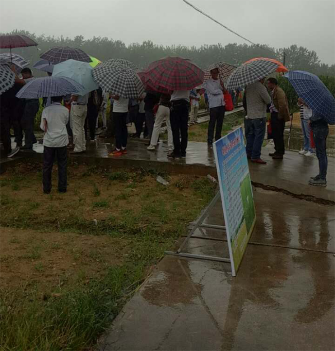 2017年8月31日上午,來(lái)自裕安區(qū)15個(gè)鄉(xiāng)鎮(zhèn)參加裕安區(qū)農(nóng)業(yè)推廣中心組織的新型職業(yè)農(nóng)民(種植業(yè)班)學(xué)習(xí)培訓(xùn)的種糧大戶,冒雨參觀了位于金安區(qū)稻麥良種場(chǎng)的“六安市水稻新品種展示(示范)區(qū)”暨安徽喜多收種業(yè)試驗(yàn)示范基地。安徽喜多收種業(yè)科技有限公司副總經(jīng)理趙見朝親自接待參觀者,技術(shù)總監(jiān)高級(jí)農(nóng)藝師曹洪現(xiàn)場(chǎng)詳細(xì)介紹了展示品種的特征特性,種糧大戶一邊聽講解,一邊現(xiàn)場(chǎng)觀摩見證,種糧大戶們對(duì)親眼所見的“深兩優(yōu)571、C兩優(yōu)198、裕兩優(yōu)華占”等水稻新品種在今年持續(xù)高溫?zé)岷投啻未箫L(fēng)襲擊下所表現(xiàn)出的耐高溫性、抗倒性和豐產(chǎn)性表示十分滿意。對(duì)自己的家鄉(xiāng)能夠自主培育出如此眾多的優(yōu)質(zhì)、高產(chǎn)、多抗、廣適的水稻新品種感到由衷的自豪!