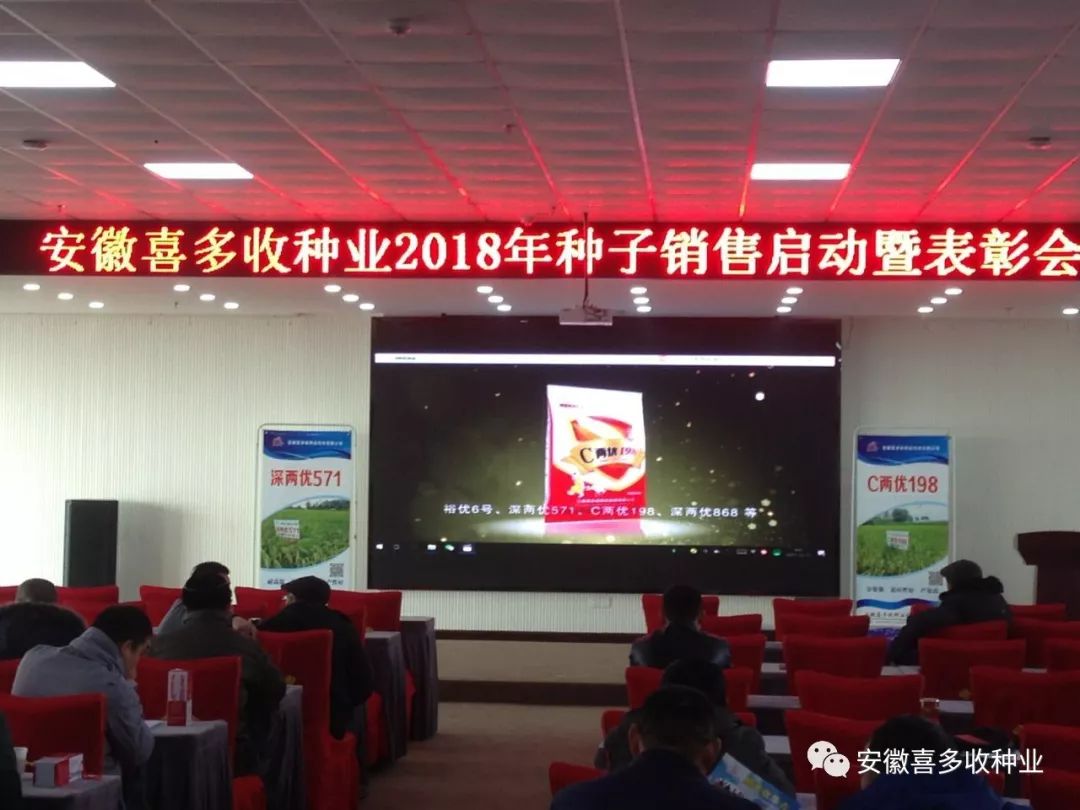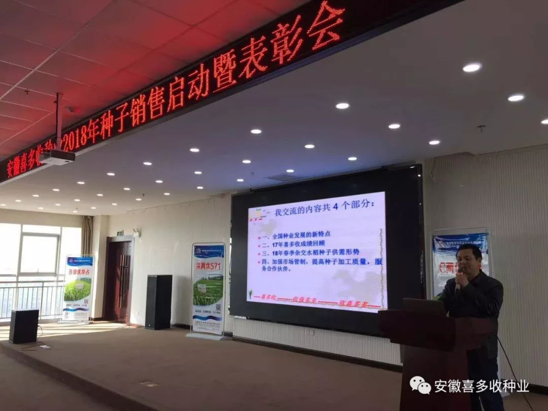 公司本著以質(zhì)量求生存,以創(chuàng)新謀發(fā)展的經(jīng)營(yíng)理念,充分發(fā)揮地域優(yōu)勢(shì),努力為六安農(nóng)民朋友持續(xù)供應(yīng)優(yōu)質(zhì)良種。在此基礎(chǔ)上公司自主科研創(chuàng)新得到長(zhǎng)足的進(jìn)步,一大批自主選育的新品種先后通過(guò)各級(jí)審定,其中有優(yōu)質(zhì)抗倒的深兩優(yōu)571,高產(chǎn)多抗的C兩優(yōu)198,在經(jīng)過(guò)農(nóng)戶的廣泛種植后,深得廣大農(nóng)戶喜愛(ài),為農(nóng)戶增產(chǎn)增效做出應(yīng)有貢獻(xiàn);公司將不遺余力繼續(xù)推進(jìn)科研創(chuàng)新及新品種選育步伐,目前公司自主選育的喜兩優(yōu)絲苗、巧兩優(yōu)絲苗、喜兩優(yōu)超占、深兩優(yōu)276、深兩優(yōu)2688、裕兩優(yōu)華占等一大批高產(chǎn)、優(yōu)質(zhì)、多抗的新組合陸續(xù)進(jìn)入各級(jí)區(qū)試,它們的育成將會(huì)更大的提高安徽喜多收種業(yè)的服務(wù)能力,為廣大農(nóng)民朋友節(jié)本增效、增加收益做出更大貢獻(xiàn)。 會(huì)上,安徽喜多收種業(yè)有限公司董事長(zhǎng)胡宗兵先生對(duì)大會(huì)做了主旨發(fā)言。首先,胡總對(duì)中國(guó)種業(yè)發(fā)展和新特點(diǎn)、新形勢(shì)和與會(huì)者做了交流,在面對(duì)千家萬(wàn)戶的種企、琳瑯滿目的品種,希望大家擦亮眼睛選擇負(fù)責(zé)任的種業(yè)企業(yè)、選擇穩(wěn)產(chǎn)高產(chǎn)的品種深度合作;其次,胡總向大家介紹了喜多收種業(yè)在2017年的發(fā)展成績(jī),這一年里安徽喜多收種業(yè)成功設(shè)立了安徽喜多收種業(yè)合肥分公司、裕安區(qū)喜多收種業(yè)科技有限公司等兩家分支機(jī)構(gòu),更好的服務(wù)大眾;在科研上2017年公司的深兩優(yōu)868通過(guò)安徽省審定,40多個(gè)新組合成功進(jìn)入各級(jí)區(qū)試;多個(gè)品種榮獲各級(jí)主管部門的科研、創(chuàng)新、發(fā)明獎(jiǎng)勵(lì)。第三、胡總向大家介紹了2018年春季雜交水稻種子的供需形勢(shì),2017年是個(gè)多災(zāi)的年份,嚴(yán)峻的氣候狀況不僅考驗(yàn)了糧食的大田生產(chǎn),更加考驗(yàn)了種子生產(chǎn)。多省的生產(chǎn)基地受到災(zāi)害性氣候侵襲,造成減產(chǎn)、質(zhì)量下降,提醒廣大用戶要選好種。最后,胡總向大家介紹了目前喜多收的種源情況、種子質(zhì)量狀況、市場(chǎng)管理措施等問(wèn)題,保證以優(yōu)質(zhì)的種子為大家提供更好的服務(wù)。
