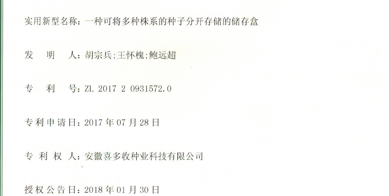 實用新型專利《一種可將多種株系的種子分開存儲的儲存盒》授權(quán)證書