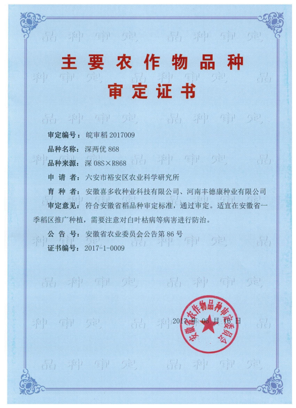 深兩優(yōu)868證書